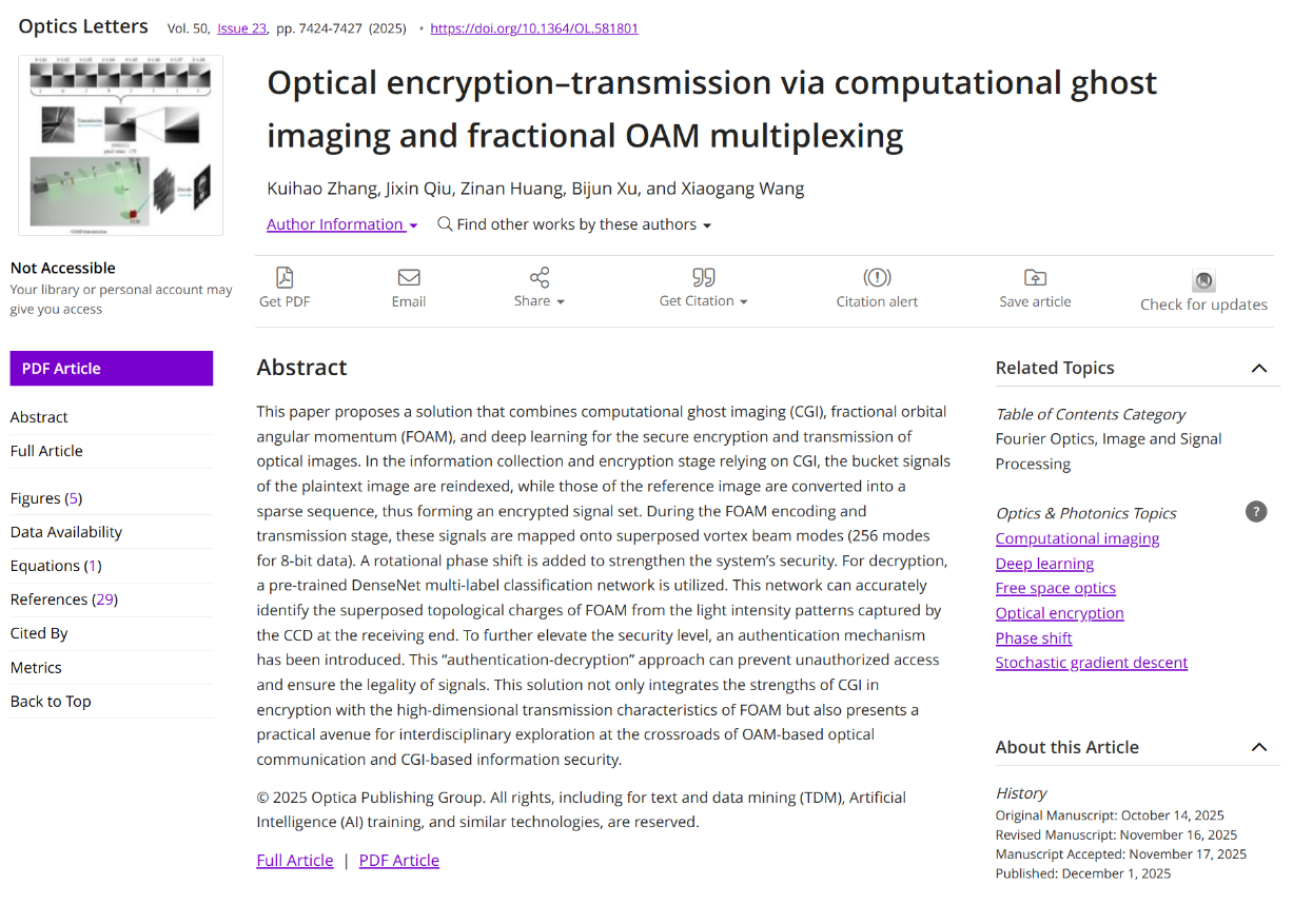 理学院光子与光场调控研究团队在光学信息安全传输领域取得重要进展,相关成果以《Optical encryption–transmission via computational ghost imaging and fractional OAM multiplexing》为题,发表于光学领域权威期刊《Optics Letters》(影响因子 3.3,JCR 一区、中科院二区)。浙江科技大学为唯一署名单位,应用物理系 2023 级研究生张魁浩为第一作者,汪小刚教授、徐弼军教授分别为通讯作者和共同指导教师。