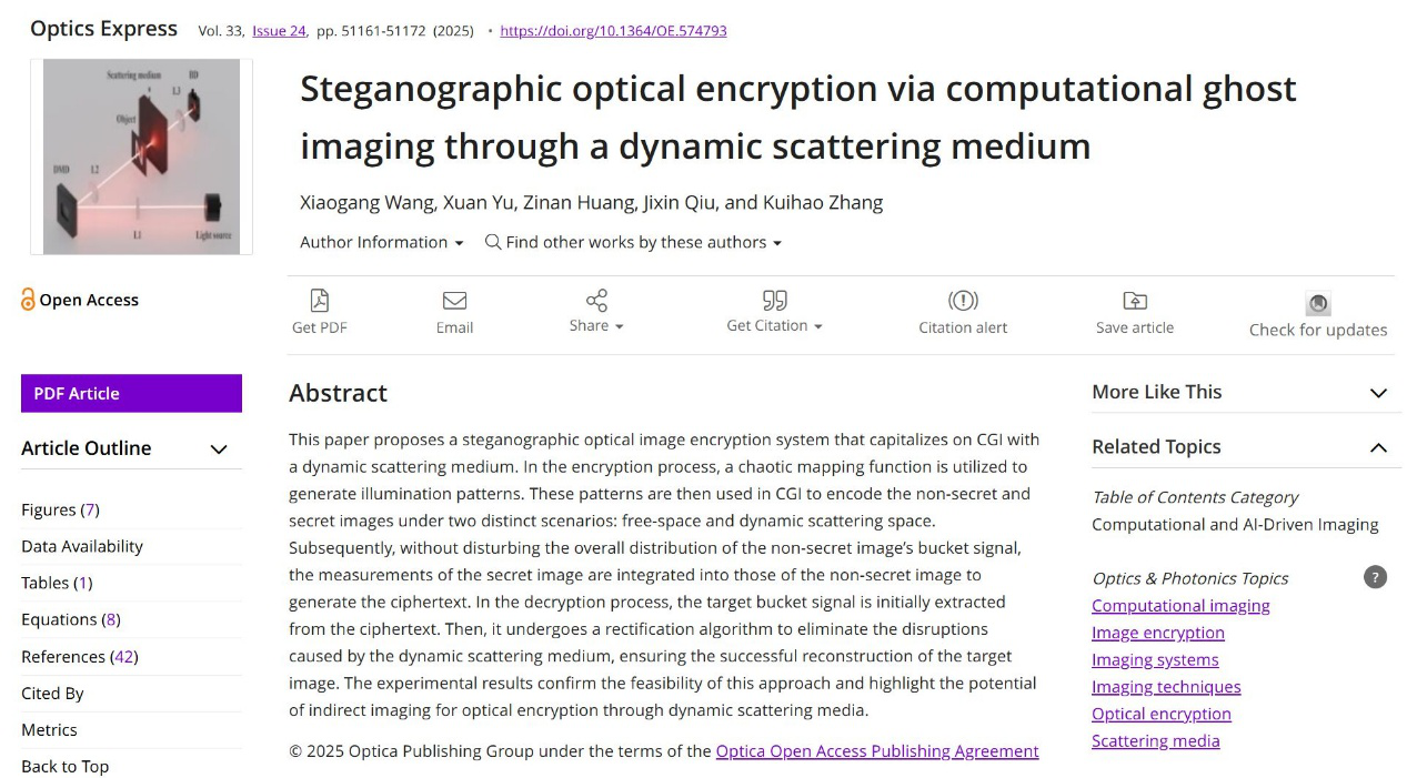 同期,光子与光场调控研究团队在光学领域知名学术期刊《Optics Express》(影响因子3.3,JCR一区、中科院二区)发表了题为“Steganographic optical encryption via computational ghost imaging through a dynamic scattering medium”的研究论文。该成果提出了一种利用动态散射介质结合计算鬼成像的隐写式光学加密系统。加密过程中,分别在自由空间和动态散射空间两种场景下对非秘密图像和秘密图像进行编码。接着,在不干扰非秘密图像桶信号整体分布的前提下,将秘密图像的测量数据融入非秘密图像的测量数据中,从而生成密文。解密阶段,先从密文中提取目标桶信号,再通过校正算法消除动态散射介质造成的干扰,确保目标图像成功重建。实验结果验证了该方法的可行性。该工作凸显了基于动态散射介质的间接成像技术在光学安全领域的应用潜力。浙江科技大学为第一署名单位,汪小刚教授为共同第一作者和通讯作者。(图文:汪小刚)