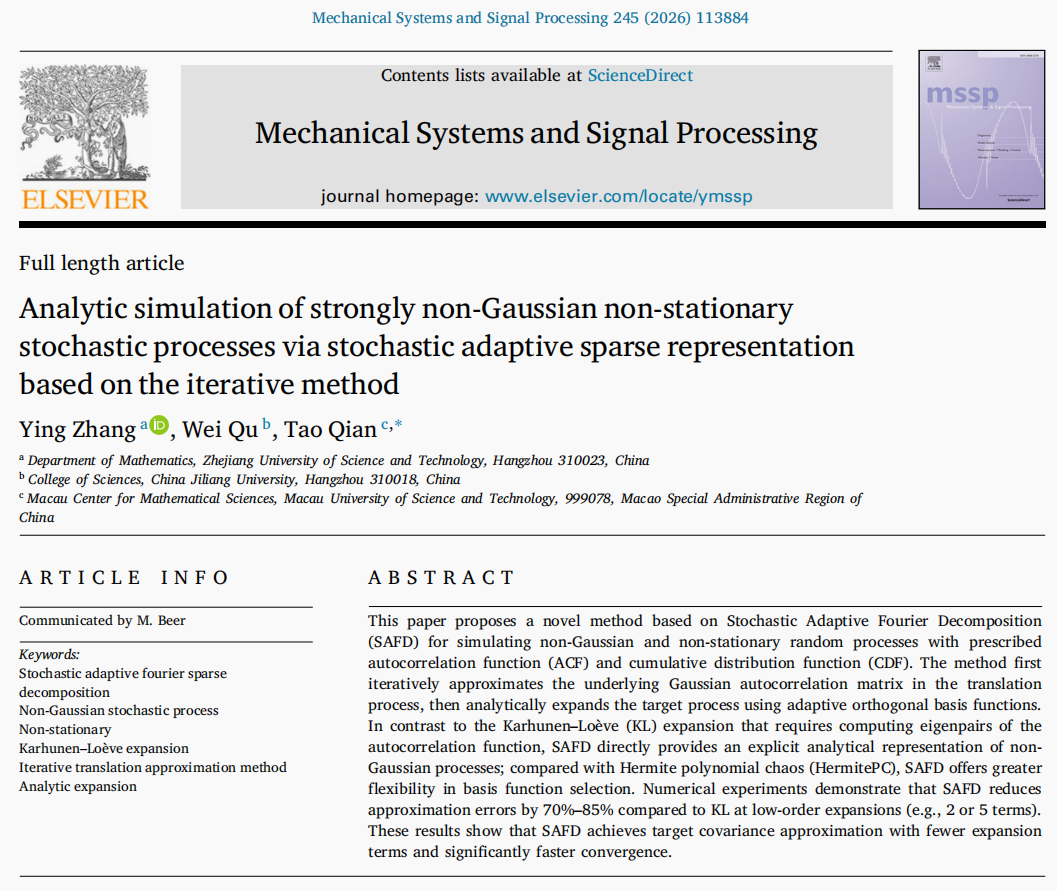 近日,理学院实分析与调和分析及应用团队张影博士与合作者在非高斯随机过程模拟与信号分析领域取得重要研究进展,相关成果发表在国际权威期刊《Mechanical Systems and Signal Processing》(简称MSSP,中科院一区Top,影响因子为8.9)。研究成果以张影博士为第一作者,浙江科技大学为第一完成单位。成果简介如下: